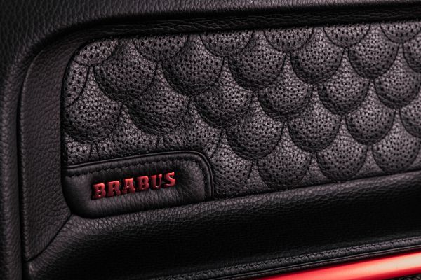 | Bệ cửa BRABUS được trang trí trong bộ 5 mảnh bằng sợi carbon có thể nhìn thấy được với thiết kế đặc biệt, với logo BRABUS được chiếu sáng với sự thay đổi màu sắc |