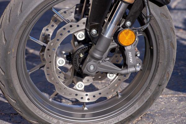 Honda CB500F 2025 mang đặc điểm khác biệt lớn nhất là cánh tay đòn trước được sơn vàng cực kỳ nổi bật và ấn tượng bởi lẽ ở thế hệ cũ thì hệ thống giảm xóc trước chỉ được sơn màu đen. Đây cũng là một nâng cấp lớn trên thế hệ CB500F mới này, bởi đây là lần đầu Honda đưa tới chiếc naked-bike tầm trung của mình hệ thống giảm xóc lộn ngược Showa Big Piston loại 41mm. Không chỉ mang tới khả năng hấp thụ xung động tốt mà các trải nghiệm đi xe cũng được tăng cường nhờ sở hữu bộ phuộc Upside Down này.