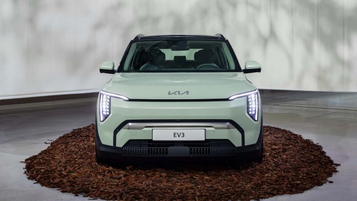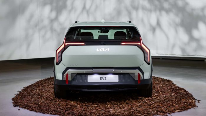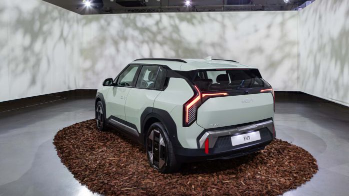 KIA EV3 2025 có ngôn ngữ thiết kế giống như chiếc SUV cỡ lớn ba hàng ghế EV9 và chiếc SUV nhỏ gọn EV5. Thân hình hộp có bề mặt cơ bắp và góc cạnh, phần nhô ra ngắn và nhà kính thẳng đứng. Các điểm nổi bật về thiết kế bao gồm đèn pha hình chữ T, cản trước thể thao với các chi tiết màu đen bóng và cách xử lý “mái nổi” được tạo ra bởi các cột A và cột C sơn đen.