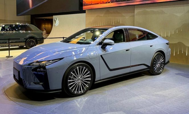 Nhìn từ bên hông, xe có kiểu dáng coupe với đường mái dốc và các bề mặt phẳng, mượt mà, cùng cổng sạc nằm ở chắn bùn bên trái. Cửa xe có đường gờ hình chữ L nổi bật với lớp sơn đen bóng, và viền đen phía dưới tạo điểm nhấn tương phản. Tay nắm cửa chìm và mâm xe kiểu khí động học mang đến vẻ ngoài gọn gàng. Ở phía sau, dải đèn hậu trải dài toàn bộ chiều rộng và cánh gió tích hợp nhấn mạnh chiều rộng của xe.