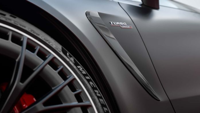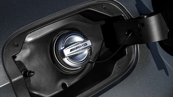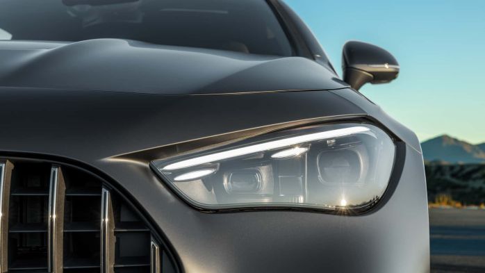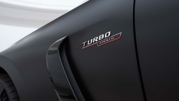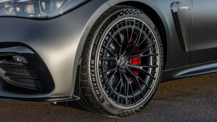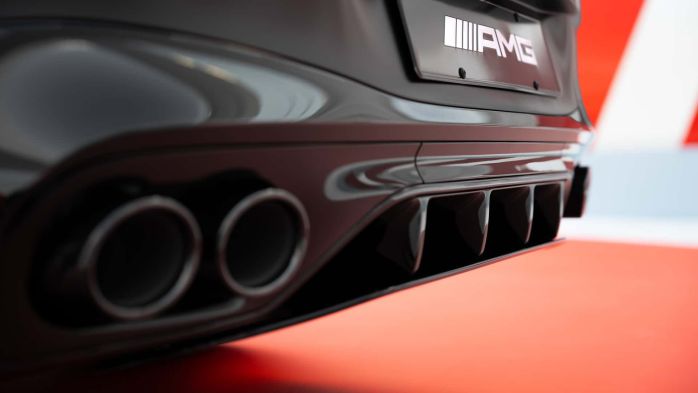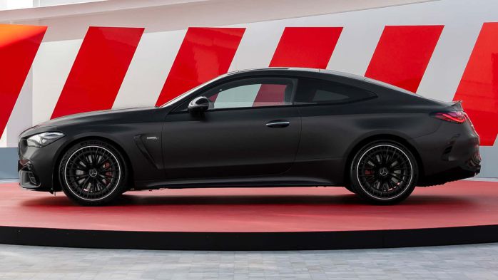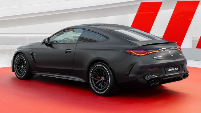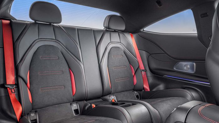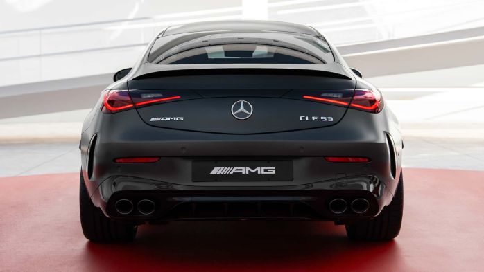 Phía sau cũng không kém phần thể thao với bốn ống xả tròn. Chúng nằm bên dưới đèn hậu LED hai phần với vỏ 3D được kết nối bằng chi tiết thiết kế màu đỏ sẫm. Bánh xe 19 inch là tiêu chuẩn, nhưng bánh xe 20 inch tùy chọn có sẵn dưới dạng tùy chọn bổ sung. Gói AMG Performance Studio tùy chọn mang đến cho chiếc coupe một cánh lướt gió phía sau rõ ràng hơn trên cốp xe và bộ khuếch tán phía sau giữa các ống xả. Hai gói AMG Night và hai gói AMG Carbon Fiber cũng sẽ có sẵn.