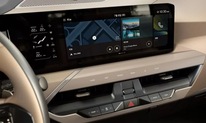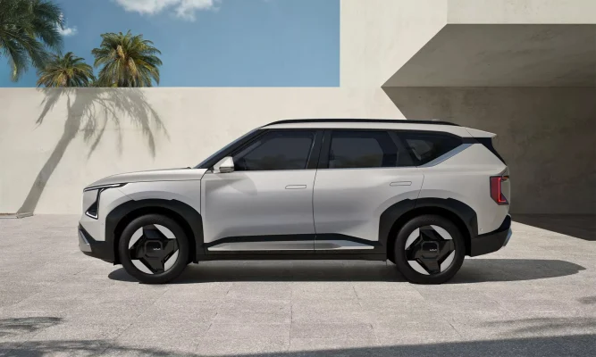 Mang các yếu tố thiết kế đặc biệt của Kia, chẳng hạn như mũi xe rộng và nắp ca-pô chắc chắn, kết hợp với nhau để tạo thành ‘Mặt hổ’ kỹ thuật số bóng bẩy, che khuất lưới tản nhiệt truyền thống để truyền tải ấn tượng rõ ràng và mạnh mẽ. Nâng cao hơn nữa thiết kế bên ngoài phía trước, EV5 kết hợp ‘Ánh sáng bản đồ ngôi sao đặc trưng’ ba chiều được hình thành bởi đèn chạy ban ngày (DRL). Lấy cảm hứng từ các chòm sao đầy sao, nó giới thiệu các hình dạng năng động dọc theo đường đèn, nhấn mạnh hơn nữa vào thiết kế Mặt hổ của EV5.